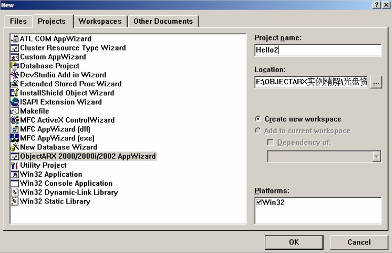 (1)启动VC++ 6.0,选择【File/New】菜单项,系统会弹出如图1.29所示的对话框。从项目列表中选择【ObjectARX 2000/2000i/2002 AppWizard】选项,输入Hello2作为项目名称,指定适当的保存位置,单击【OK】按钮。