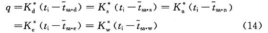 式中:q——不同朝向外墙与屋面的单位面积传热失热量(W/m2)。