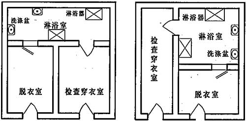 3 脱衣室的面积应按每个淋浴器不小于3m2计算,检查穿衣室面积应大于脱衣室1m2~2m2,脱衣室内应设置固定式洗消工作台、衣帽钩;