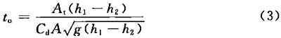 重力放空的优点是无需电力或机械驱动,符合节能环保政策,且控制简单。依靠重力排放的调蓄池,其出口流量随调蓄池上下游水位的变化而改变,出流过程线也随之改变。因此,确定调蓄池的容积时,应考虑出流过程线的变化。采用公式(4.4.9-2)时,还需事先确定调蓄池表面积At随水位h变化的关系。对于矩形或圆形调蓄设施等表面积不随水深发生变化的调蓄池,如不考虑调蓄池水深变化对出流流速的影响,调蓄池的出流可简化按恒定流计算,其放空时间可按下式估算: