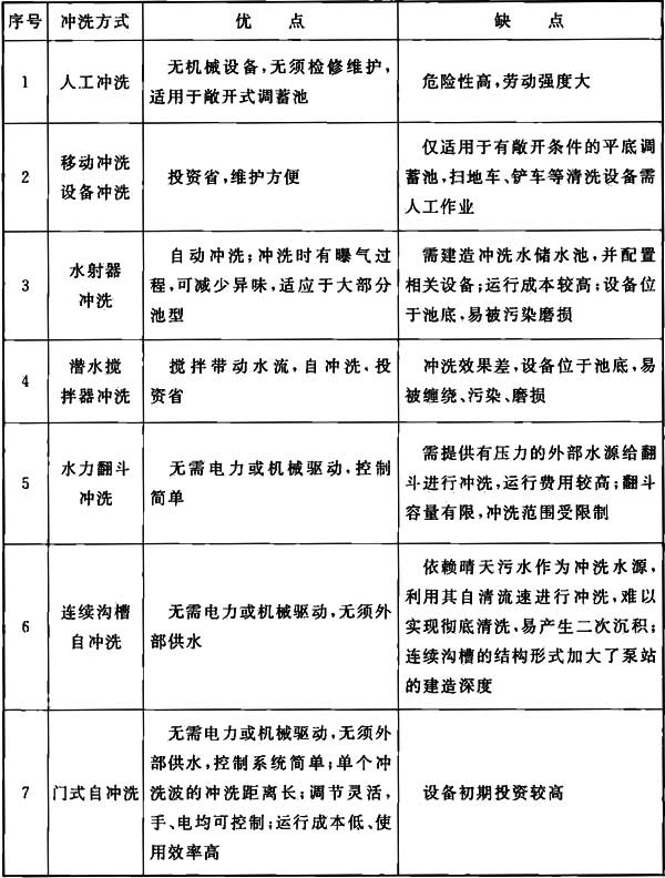 4.4.13 敞开式调蓄池可采用人工冲洗的方式,但对于封闭式调蓄池,人工冲洗危险性大且劳动强度大,一般作为调蓄池冲洗的辅助手段。调蓄池的冲洗有多种方法,各有利弊。随着节能减排的政策要求,越来越多的环保型、节能型的冲洗设施和方法得到开发应用。各种冲洗方式的优缺点如表5所示。