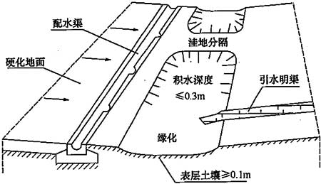 6.2.1 绿地雨水渗透设施应与景观设计结合,边界应低于周围硬化面。在绿地植物品种选择上,根据有关试验,在淹没深度150mm的情况下,大羊胡子、早熟禾能够耐受长达6天的浸泡。