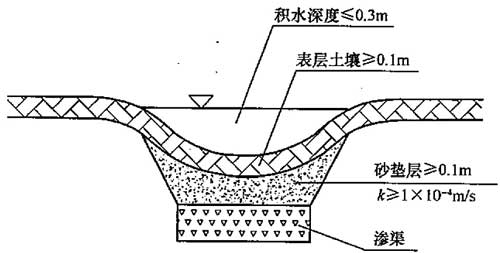 6.2.4 一般在土壤的渗透系数K≤5×10-6m/s时采用这种浅沟渗渠组合。浅沟渗渠单元由洼地及下部的渗渠组成,这种设施具有两部分独立的蓄水容积,即洼地蓄水容积与渗渠蓄水容积。其渗水速率受洼地及底部渗渠的双重影响。由于地面洼地及底部渗渠双重蓄水容积的叠加,增大了实际蓄水的容积,因而这种设施也可用在土壤渗透系数K≥1×10-6m/s的土壤。与其他渗透设施相比,这种系统具有更长的雨水滞留及渗透排空时间。渗水洼地的进水应尽可能利用明渠与来水相连,避免直接将水注入渗渠,以防止洼地中的植物受到伤害。洼地中的积水深度应小于300mm。洼地表层至少100mm的土壤的透水性应保持在K≥1×10-5m/s,以便使雨水尽可能快地渗透到下部的渗渠中去。构造形式见图12。