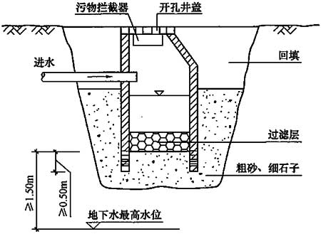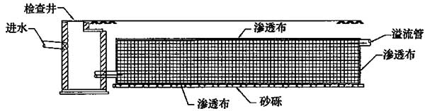 渗透管外用砾石填充,具有较大的蓄水空间。在管沟内雨水被储存并向周围土壤渗透。这种系统的蓄水能力取决于渗沟及渗管的断面大小及长度,以及填充物孔隙的大小。对于进入渗沟及渗管的雨水宜在入口处的检查井内进行沉淀处理。