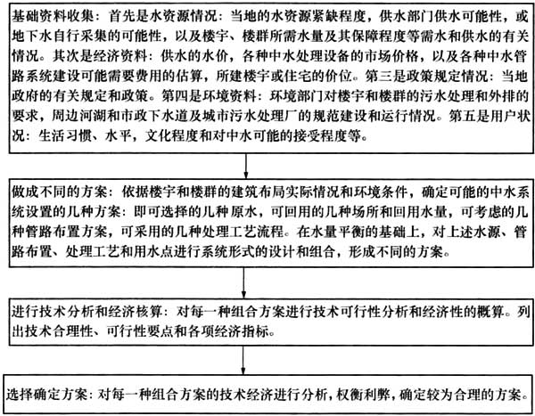 建筑中水系统形式的选用,主要依据考虑系统的安全可靠、经济适用和技术先进等原则。具体来讲建筑中水系统形式的选择应该是分几个步骤来进行: