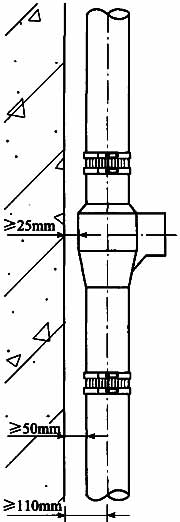 3.3.5 本条规定是考虑到加强型旋流器(包括导流连体地漏和导流三通连体地漏等)均带有局部扩容段,扩容段外径为150mm,在保证扩容段距墙体仍有不小于25mm的净距时,管中距墙即为110mm,如图3。设计时可采用110mm或150mm。管道接口与墙、梁、板的保留净距主要是为了方便检修,特别是采用法兰连接时,接口拆卸宜有更大的操作空间,取净距50mm是根据现场施工安装的一般要求确定的。