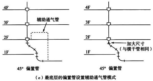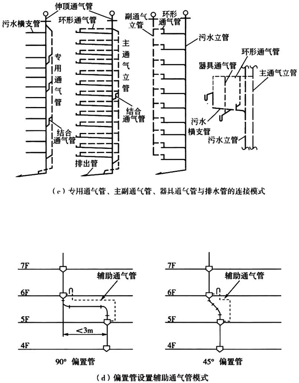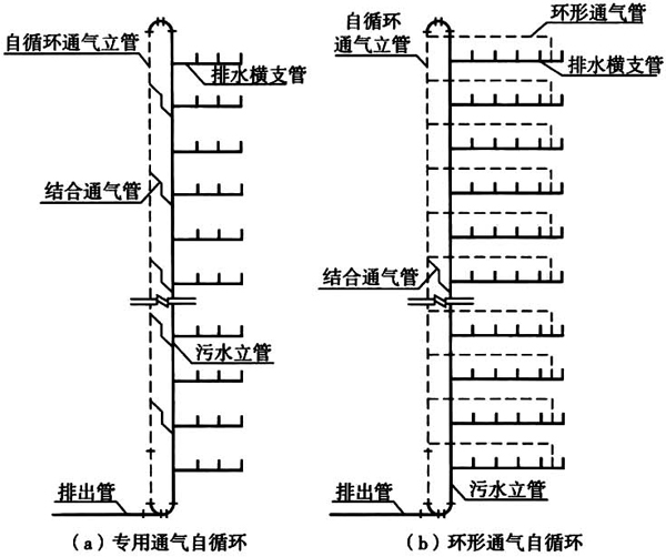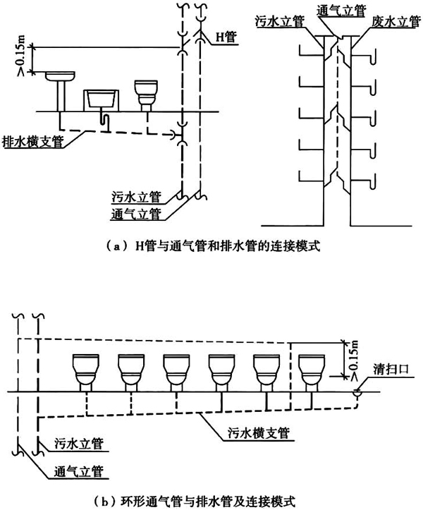 4.7.10 本标准第4.7.9条和第4.7.10条的自循环通气系统管配件的连接是根据上海现代建筑设计集团有限公司与同济大学合作测试研究成果确定,并在日本测试塔得到验证。本条自循环通气模式见图2。