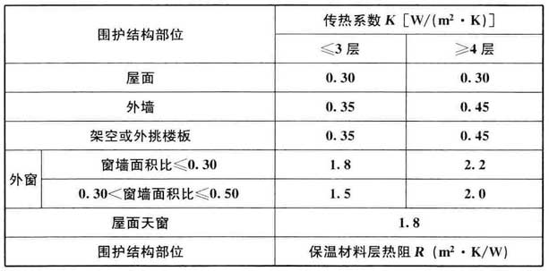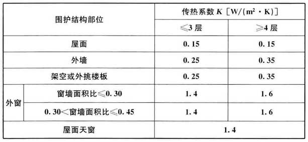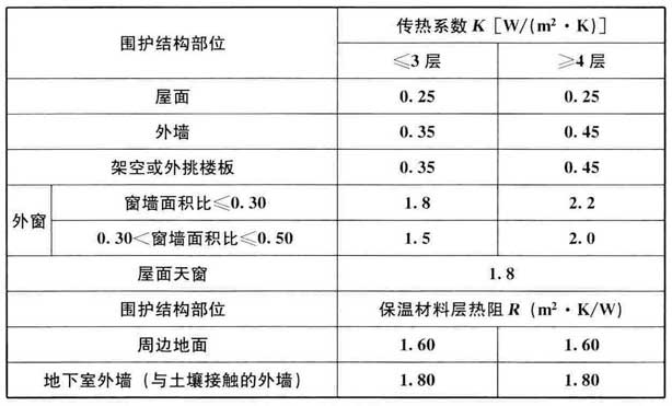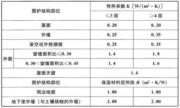 4.2.1 根据建筑物所处城市的气候分区区属不同,建筑外围护结构的传热系数不应大于表4.2.1-1~表4.2.1-5规定的限值,周边地面和地下室外墙的保温材料层热阻不应小于表4.2.1-1~表4.2.1-5规定的限值。当建筑外围护结构的热工性能参数不满足上述规定时,必须按照本标准第4.3节的规定进行围护结构热工性能的权衡判断。