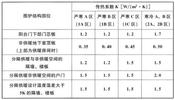 4 当阳台和直接连通的房间之间设置隔墙和门、窗,且所设隔墙、门、窗的热工性能不符合本标准第4.2.1条和第4.2.6条的规定时,阳台与室外空气接触的墙板、顶板、地板的传热系数不应大于本标准第4.2.1条中所列限值的120%,严寒地区阳台窗的传热系数不应大于2.0W/(m2·K),寒冷地区阳台窗的传热系数不应大于2.2W/(m2·K),阳台外表面的窗墙面积比不应大于0.60,阳台和直接连通房间隔墙的窗墙面积比不应超过本标准表4.1.4的限值。当阳台的面宽小于直接连通房间的开间宽度时,可按房间的开间计算隔墙的窗墙面积比。