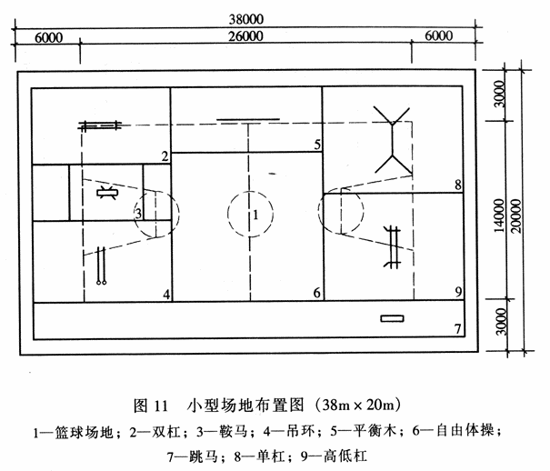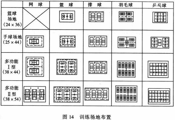 而为了适应训练活动的要求,有效利用场地,也可在建议尺寸基础上有所调整,如图14中提出的38m×44m和38m×54m的场地示意。