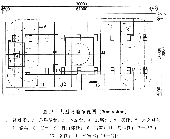 6.2.2 从国外体育设施多功能使用的实践看,属于体育方面的除球类、体操、冰球等内容外,还有室内田径、马术、自行车、拳击甚至一些水上项目,而其他内容的多功能使用则包括文艺演出(如流行音乐会、古典剧、大型剧)马戏杂技、展览会、庆典仪式等,因情况各不相同,故提出原则要求。