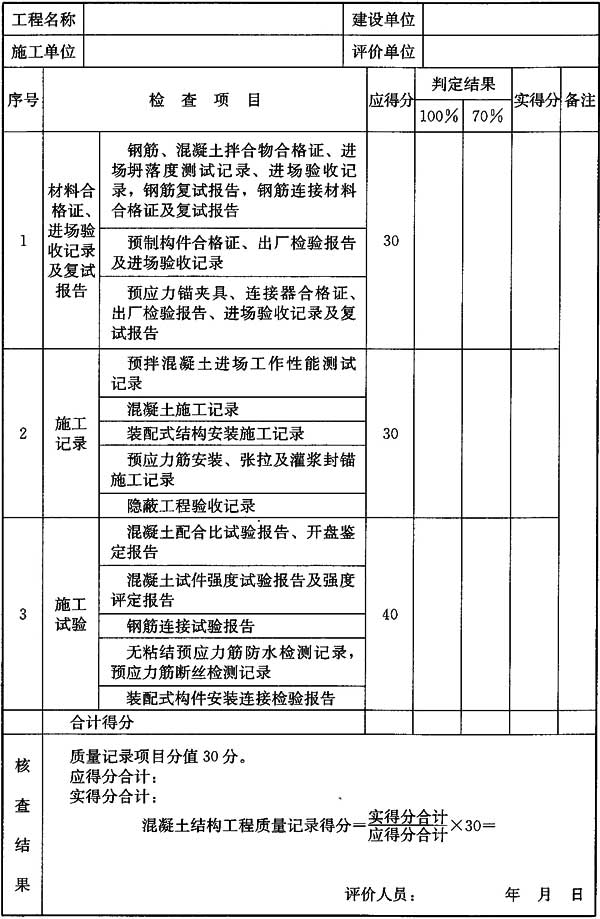 1)检查标准:结构实体混凝土强度应按不同强度等级分别验证,检验方法宜采用同条件养护试件方法,检验符合规范规定的应为一档,取100%的分值;当未取得同条件养护试件强度或同条件养护试件强度不符合要求时,可采用回弹-取芯法进行检验,检验符合规范规定的应为二档,取70%的分值。