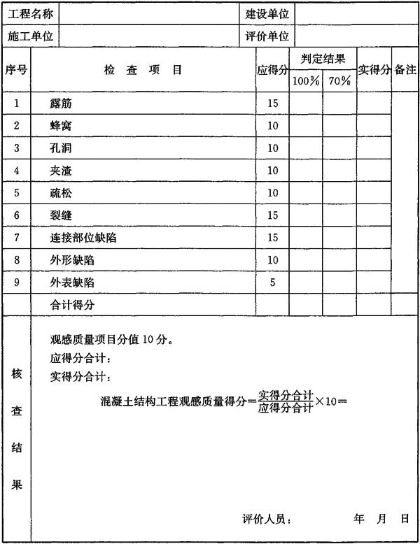 表5.1.7 混凝土结构工程观感质量项目及评分