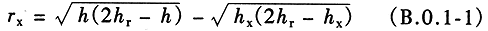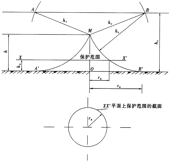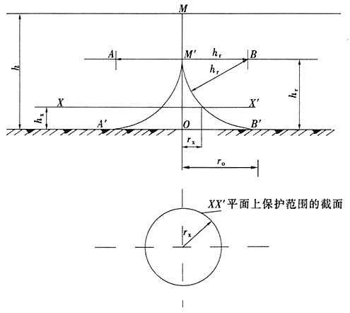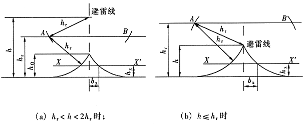 2 当避雷针高度(h)大于滚球半径(hr)时(图B.0.1-2),避雷针在被保护物高度的XX′平面上的保护半径和在地面上的保护半径可按下列公式确定: