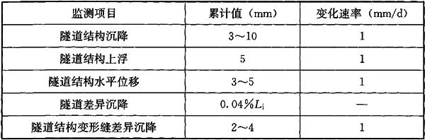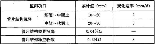 15.5.2 监测项目控制值是工程施工过程中对结构自身及周边环境安全状态或正常使用状态进行判断的重要依据,也是工程设计、工程施工及施工监测等工作的重要控制点。监测项目控制值的大小直接影响到结构自身和周边环境的安全,对施工进展和监测手段的确定有一定影响。因此,合理确定监测控制值是一项十分重要的工作。隧道管片结构竖向位移、净空收敛及隧道周边环境等监测控制值,根据工程地质条件和当地施工经验确定,也可参照表4~表7执行。
