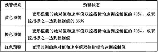 15.5.4 监测预警等级的划分要与工程所在地区、工程项目特点、施工经验相适应,具体的预警等级可根据工程实际需要确定,一般取监测控制值的70%、85%和100%划分为三级。北京市轨道交通工程监测预警体系较为成熟,其监测预警分级标准见表8。