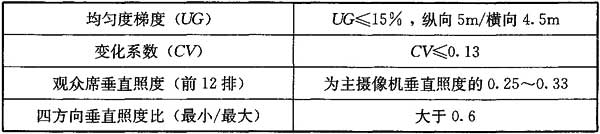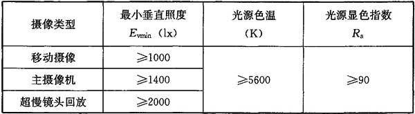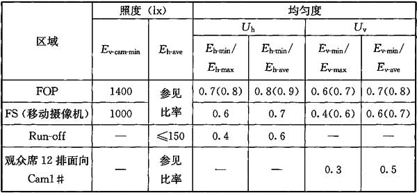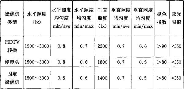 注:1 平均水平和垂直照度比率:推荐照度比率为0.75~1.5。如果有高清转播,其他相机的水平照度均按照高清转播来处理;