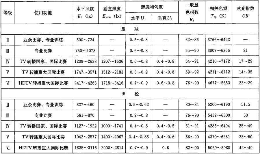 本标准规定的照明标准值参考了国际田联(IAAF)、国际足联(FIFA)、国际单项体育联合会(GAISF)、奥林匹克广播服务公司(OBS)、国际照明委员会(CIE)、中国田协(CAA)、中国网协(CTA)等国内外标准的相关规定(表4~表18)。