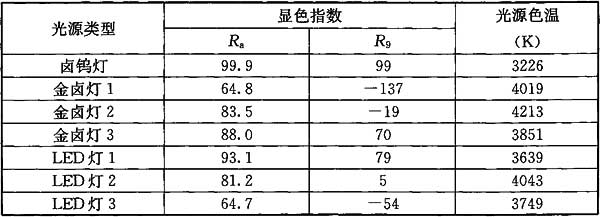 实验用光源:本研究所选择的实验用光源包括标准光源卤钨灯,以及标称显色指数为65、80和90的金卤灯;另选择了标称65、80和90的LED灯进行了实景物体色彩还原主观评价研究。七种光源的具体实测性能参数见表22。