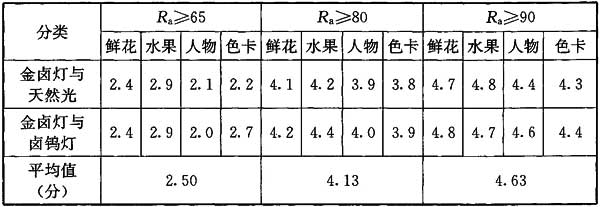 ①显色指数65的光源与显色指数80及以上光源照射下的场景主观评价存在较为明显而显著地差异;