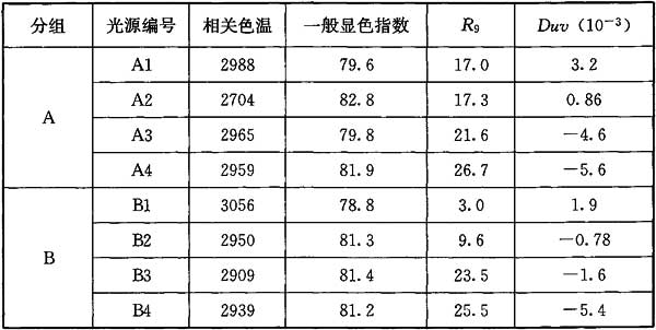实验光源:对266种不同的LED光源进行光度和色度的测试,从其中选出了8种白光光源进行本实验。其中7种LED光源的相关色温比较接近(从2909K~3056K),一般显色指数为80±2,R9变化范围从3~27。额外选择一种明显低色温的LED光源。LED光源色度参数列于表26。