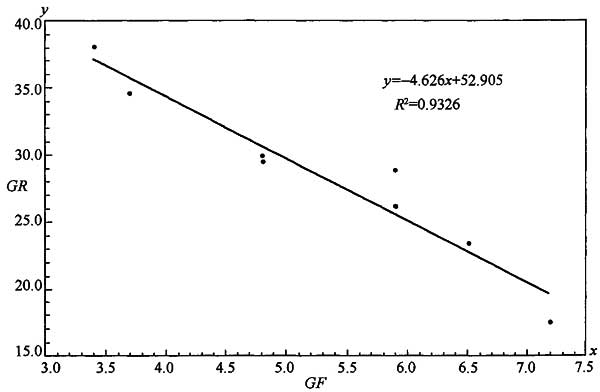 经过回归分析,可得到GR与GF有如下关系:即GR=—4.626GF+52.905,其标准差为0.9326。所有数据的相关系数r为—0.779。