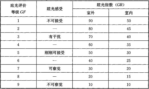 本标准眩光指数值是参照《室外运动场地和区域照明的眩光评价系统》CIE 112-1994制订的。该评价系统仅对室外场所的眩光作出了具体规定,到目前为止,室内体育馆的眩光还没有合适的评价方法。从国内外研究资料及现场实测结果来看,CIE 112中提出的室外场所眩光评价系统可以应用于室内场馆的眩光评价,但由于室外和室内场所的照明系统和环境特点不相同,使得眩光评价等级和最大眩光限制值也不相同。