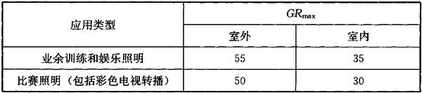 主观评价结果表明,眩光评价等级GF与眩光测量计算值GR之间有较好的相关性,室外场所眩光评价系统可以应用于室内场馆的眩光评价。推荐的室内体育馆眩光评价等级和推荐的眩光指数值见表27、表28。