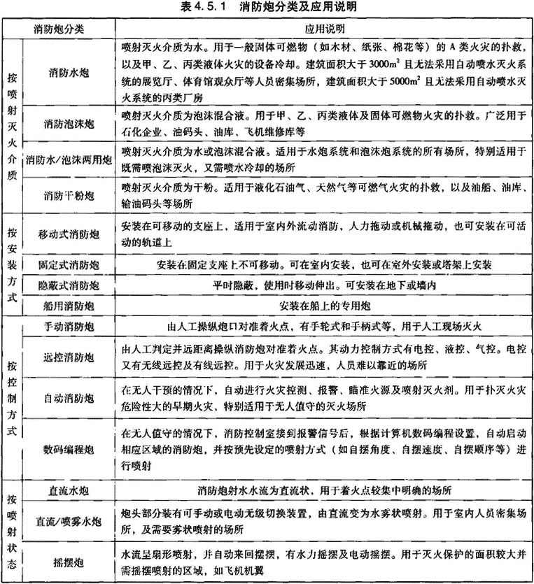 2 消防炮分类及应用说明见表4.5.1。