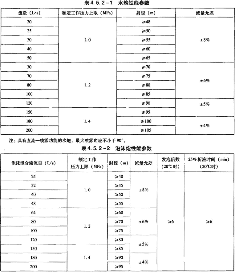 1 水炮性能参数见表4.5.2-1,泡沫炮性能参数见表4.5.2-2。