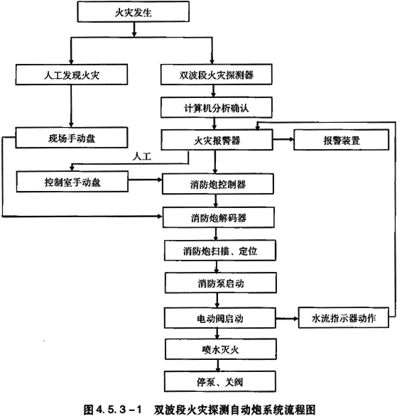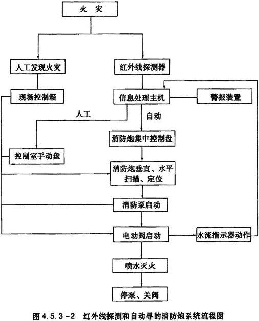 该系统是在消防炮的前端安装有红外探测器(热成像摄像机),随炮头转动而发现火灾,这就是一级探测,火灾的红外辐射被转化为电信号,经计算机筛选,排除其它干扰信号并确认火灾后,消防炮的水平找火机构驱动消防炮水平旋转探测,以确认着火点,这是二次探测,然后垂直找火机构驱动消防炮垂直转动,调整俯仰角,最后确认并瞄准着火点,这是第三次探测。通过三次探测、确认后,即自动开启水泵、阀门等,将灭火剂喷向目标。火灾扑灭后,自动停泵关阀,恢复至设备初始状态。其系统流程图见图4.5.3-2。