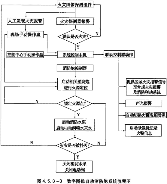 火灾发生时,数字图像火灾探测器(摄像机)将图像传至主计算机,计算机的专用软件模拟人的视觉原理,对火灾图像进行动态分析,区别其他光源以确认是否火灾。炮头上的火灾定位器可以跟踪移动火源和多点火源对火灾进行智能识别,将着火点的空间坐标传输给系统控制主机,以实现对消防炮系统的集中控制和管理。当系统放在自动档时,自动定位系统可根据火灾信号自动精确瞄准着火点,启动消防泵,开阀喷水灭火,火灾扑灭后,计算机根据火灾信号确认已经扑灭,则自动发出指令停泵关阀。其系统流程如图4.5.3-3。