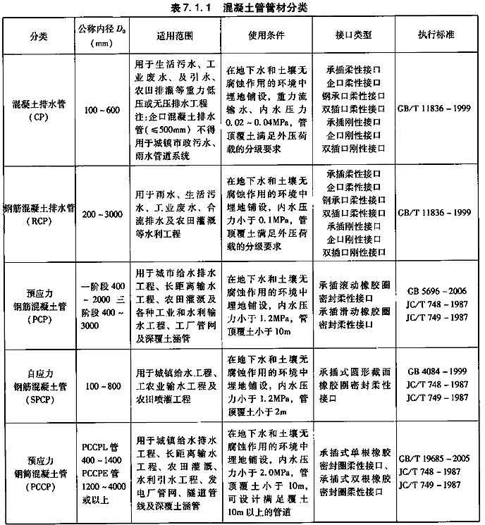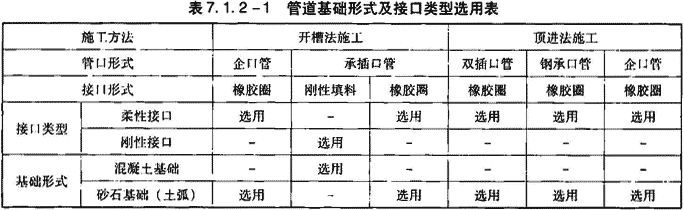 3)管道连接方式分为柔性接口管和刚性接口管。柔性接口管按接口型式分为承插口管、企口管、钢承口管和双插口管。柔性接口承插口管的型式又分为甲、乙、丙三型,这三种形式主要区别于承插接口尺寸和胶圈的安装方式。刚性接口分为承插口管型式、企口管型式、双插口管型式。管型详见国家标准GB/T 11836-1999中的图示。选用接口形式见表7.1.2-1管道基础形式及接口类型选用表。刚性接口的预制钢筋混凝土管道在混凝土基础上,其接口的适用条件为: