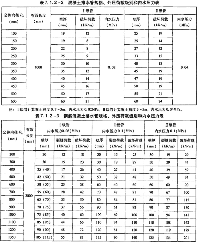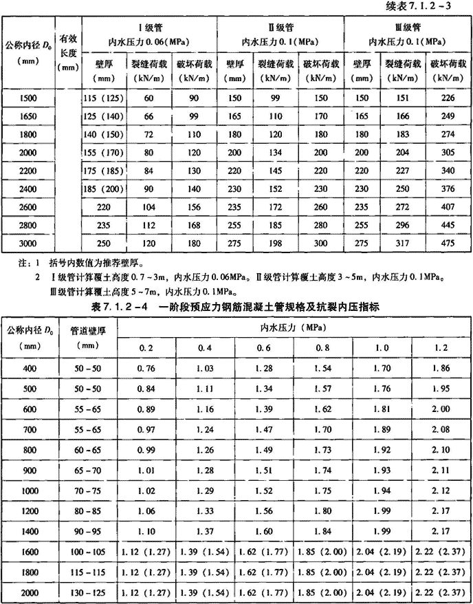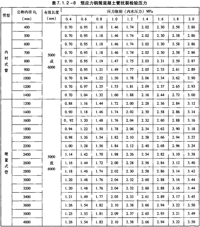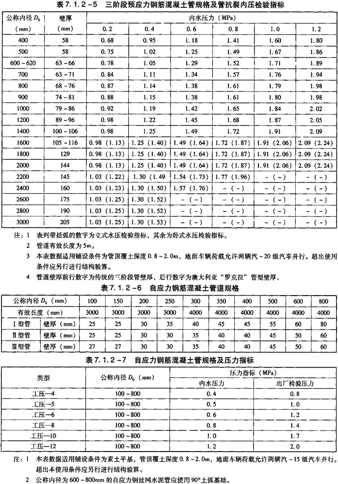 混凝土排水管规格及压力指标见表7.1.2-2。钢筋混凝土排水管规格及压力指标见表7.1.2-3。预应力钢筋混凝土管规格及压力指标见表7.1.2-4及表7.1.2-5。自应力钢筋混凝土管规格及压力指标见表7.1.2-6及表7.1.2-7。预应力钢筒混凝土管抗裂检验压力见表7.1.2-8。