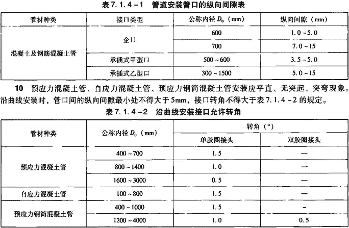 9 混凝土及钢筋混凝土管沿直线安装时管口的纵向间隙应符合表7.1.4-1的规定。