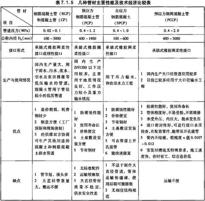 4)在施工条件差(地下水位高、有流砂等)及地基承载力差的场合,使用强度高即外压等级高的管子,敷设费用较低,减少工程投资,在内压大于0.06MPa的管段上必须选用钢筋混凝土管。