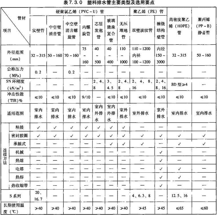 塑料排水管主要类型及选用要点见表7.3.0。