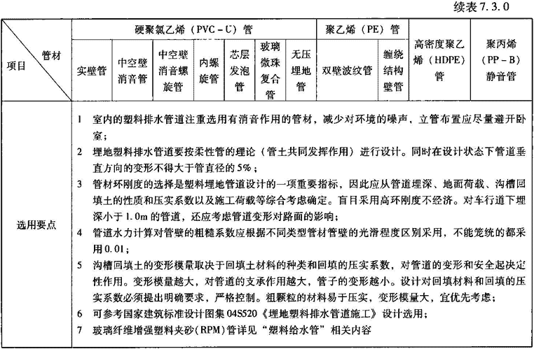 3 选用要点:产品选用应对环刚度、结构壁管型式、原材料性能、连接方式、颜色、长度、内径和壁厚、物理力学性能和系统适应性提出要求。