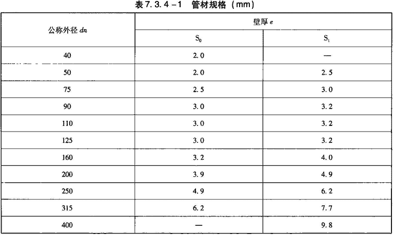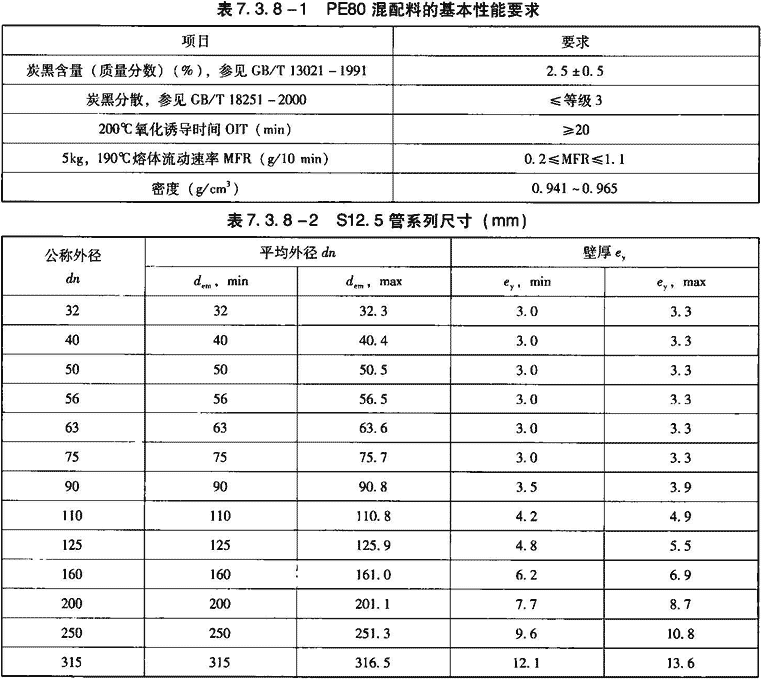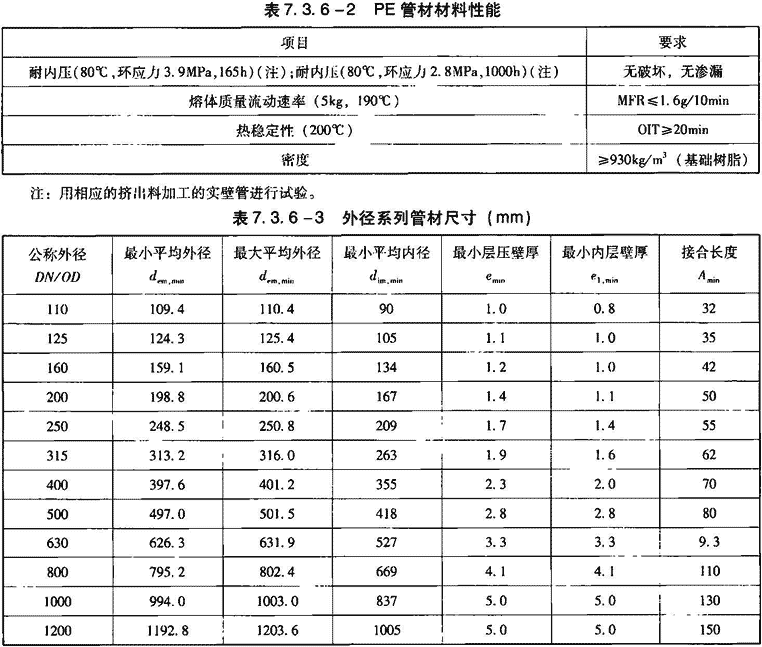 2)管材和管件颜色应为黑色。管材有效长度一般为6m,不允许有负偏差。管材内径和壁厚见表7.3.7-2。