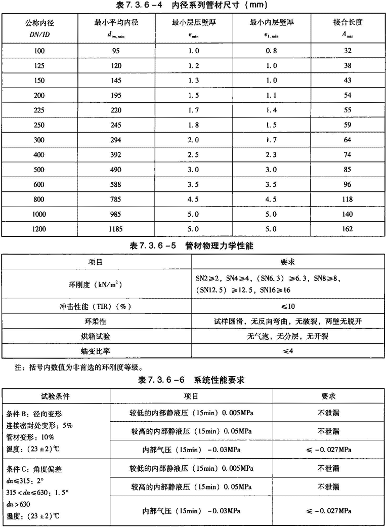 5)管材物理力学性能应符合表7.3.6-5规定。采用弹性密封圈连接时,应按表7.3.6-6要求进行系统适应性测试。