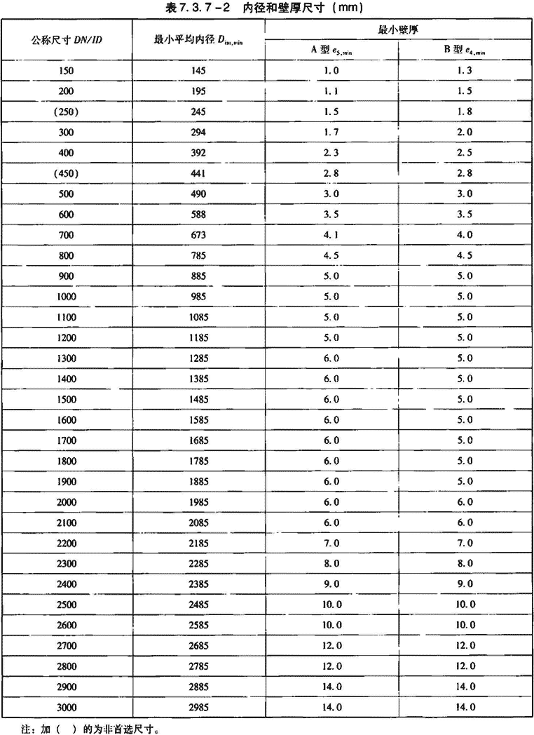 注:括号内数值为非首选等级。管材DN/ID≥500mm时允许有SN2等级。管材DN/ID≥1200mm时,可按工程条件选用环刚度低于SN2等级的产品。