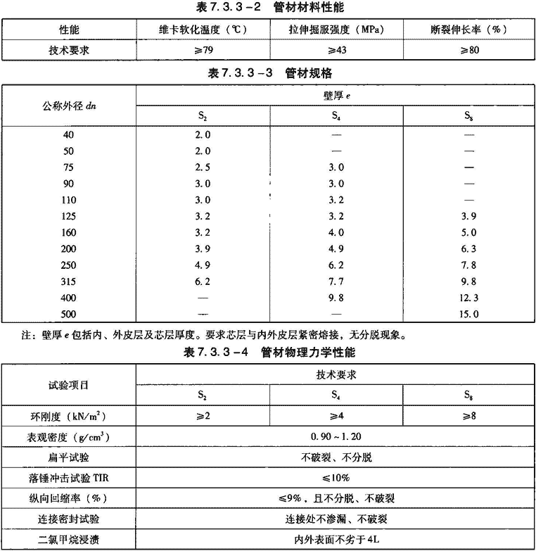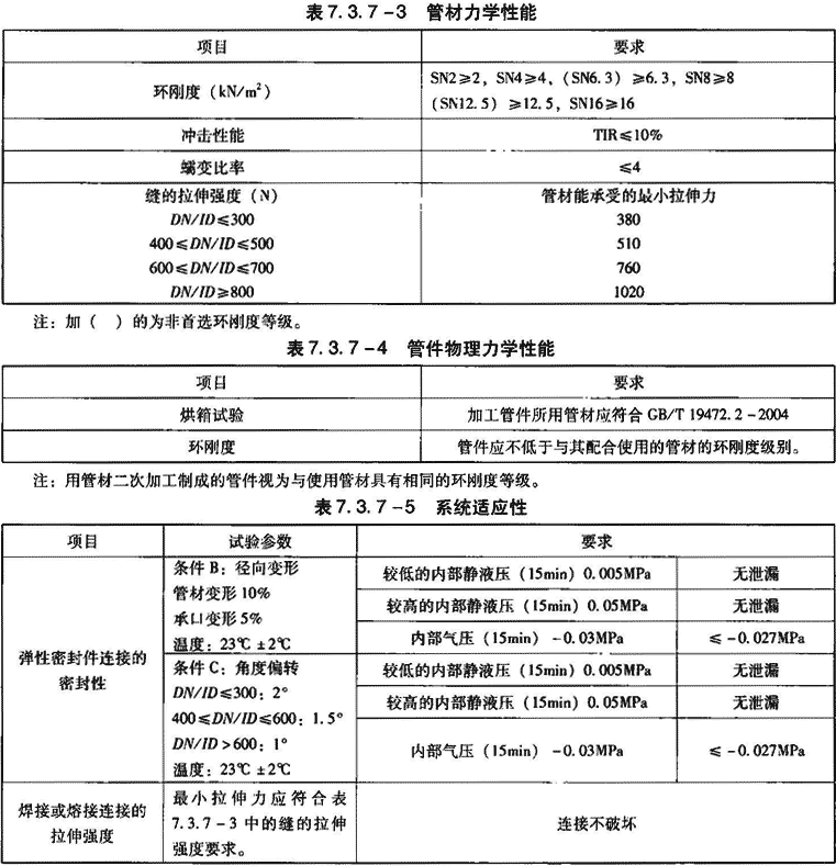 3)管材纵向回缩率应≤3%(针对A型管材),且无分层及开裂现象。烘箱试验(针对B型管材)时,管材熔缝处应无分层及开裂现象。力学性能见表7.3.7-3。管件物理力学性能见表7.3.7-4。系统适应性见表7.3.7-5。
