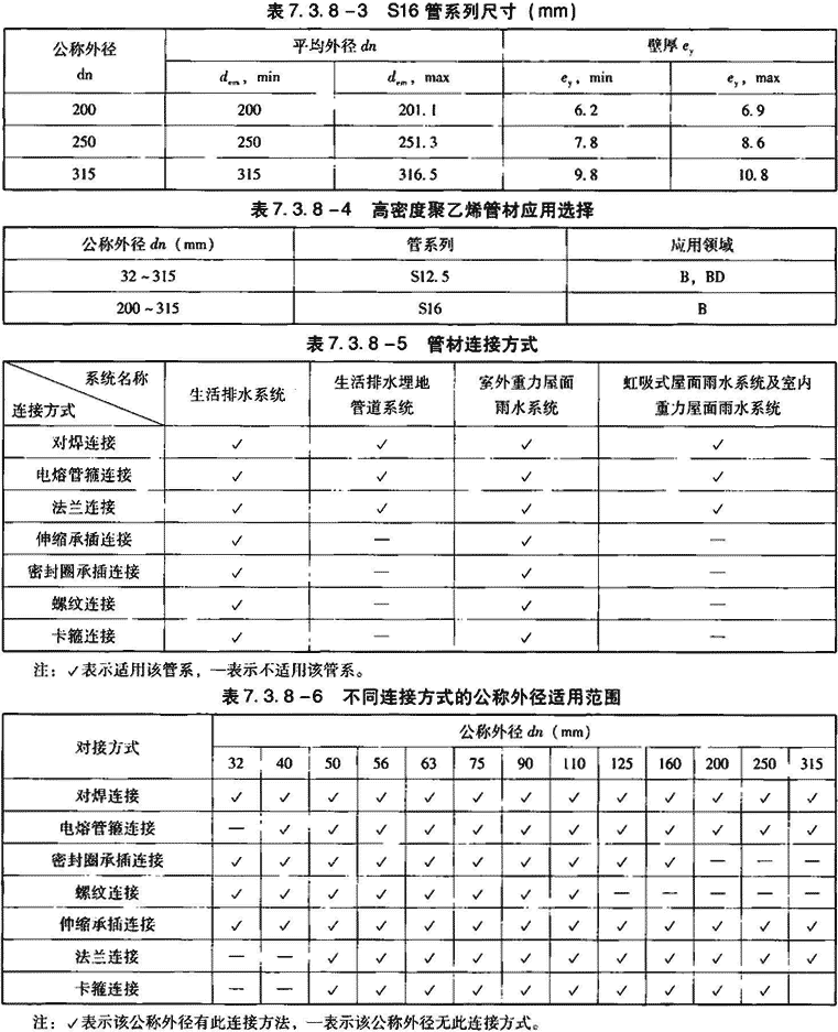 4)管材连接方式见表7.3.8-5,不同连接方式的公称外径适用范围见表7.3.8-6。