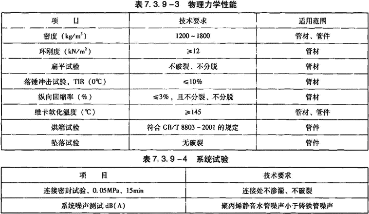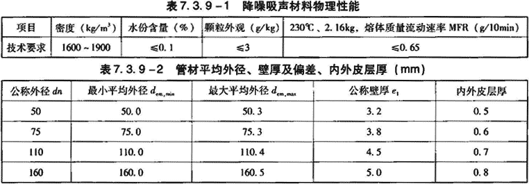 1)管材中间层的降噪吸声材料的物理性能应符合表7.3.9-1的规定。管件应采用符合表7.3.9-1的降噪吸声材料和聚丙烯(PP-B)材料共混专用料制造。