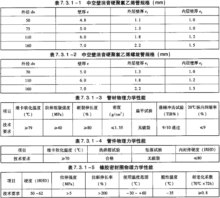 1)中空壁消音硬聚氯乙烯管规格见表7.3.1-1。中空壁消音硬聚氯乙烯螺旋管规格见表7.3.1-2。管材物理力学性能见表7.3.1-3。