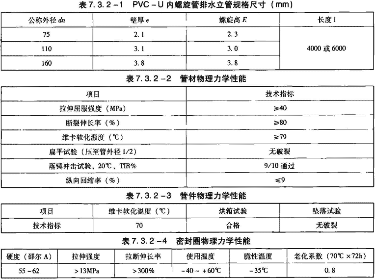 1)内螺旋立管的规格尺寸见表7.3.2-1。管材与管件的理力学性能见表7.3.2-2、表7.3.2-3。