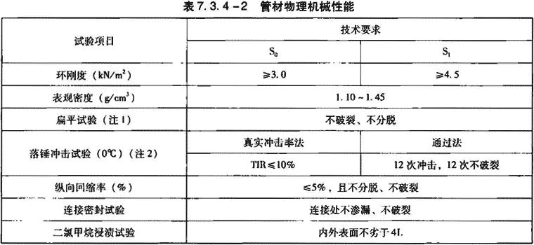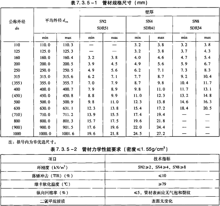 2)管材长度一般为4m、6m,长度不允许有负偏差。规格尺寸应符合表7.3.5-1的规定。其物理力学性能应符合表7.3.5-2的规定。