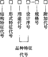 产品的全型号,由结构特征代号、形式特征代号、品种特征代号(包括用途代号和设计序号)、规格号及附加代号五部分组成,其具体组成形式如下: