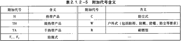 对于特殊环境使用的低压成套开关设备,可在全型号后加注特定的附加代号,其代号含义见表2.1.2-5。