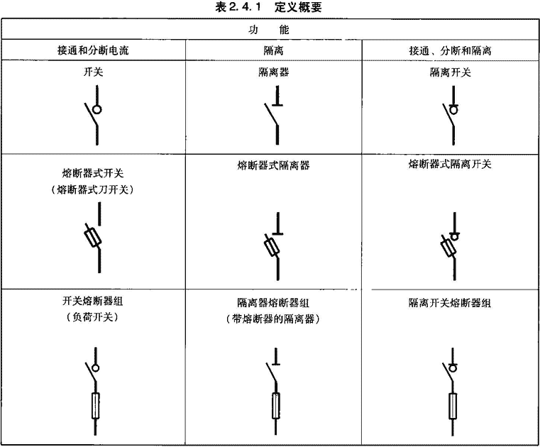 根据GB/T 4728.7-2008《电气简图用图形符号第7部分:开关、控制和保护器件》开关、隔离器、隔离开关、开关熔断器组、隔离器熔断器组、隔离开关熔断器组、熔断器式开关、熔断器式隔离器及熔断器式隔离开关的图形符号表示的定义概要见表2.4.1。